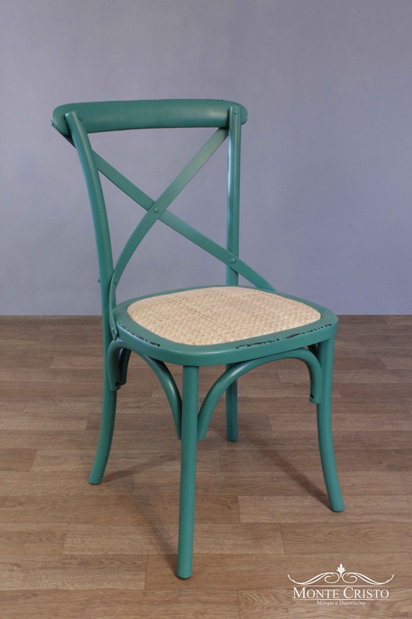 Cadeira Cross verde provençal, também disponível em outras cores. Estrutura reforçada que garante maior estabilidade e segurança, a cadeira Cross é fabricada na madeira Carvalho que recebe tratamento contra cupim além de seladora que a impermeabiliza, o assento é em palha trançada. A madeira vergada, no estilo do designer alemão Michael Thonet, faz com que a cadeira seja confortável, leve e resistente.
