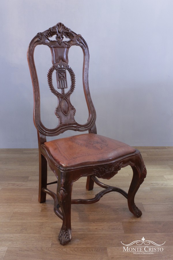 Cadeira Dom José em Jacarandá com couro. Estrutura reforçada que garante maior estabilidade e segurança, a cadeira Dom José é fabricada na madeira nobre Jacarandá que recebe tratamento contra cupim além de seladora que a impermeabiliza, o acento em couro recebe entalha artesanal. A cadeira Dom José possui influência do rococó, com pernas finas e curvadas no estilo da cadeira Luís XV.