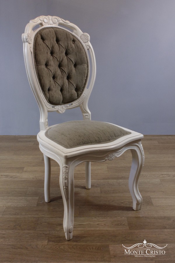 Cadeira Medalhão entalhada branca provençal com tecido, também disponível em outras cores. Estrutura reforçada que garante maior estabilidade e segurança, a cadeira Medalhão é fabricada na madeira Jequitibá que recebe tratamento contra cupim além de seladora que a impermeabiliza. A cadeira Medalhão é sinônimo de conforto e qualidade que enaltece qualquer ambiente.