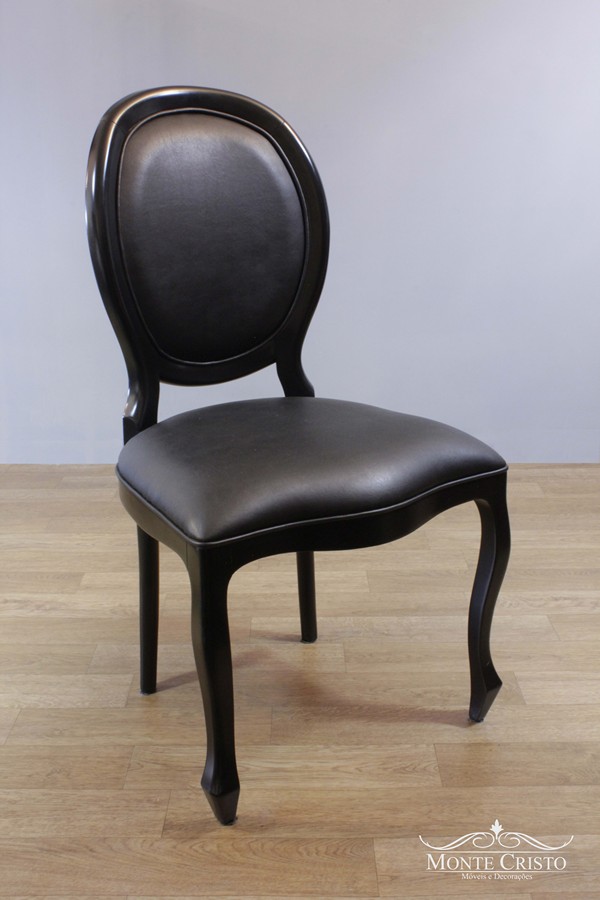 Cadeira Medalhão laca preta com couro, também disponível em outras cores. Estrutura reforçada que garante maior estabilidade e segurança, a cadeira Medalhão é fabricada na madeira Jequitibá que recebe tratamento contra cupim além de seladora que a impermeabiliza. A cadeira Medalhão é sinônimo de conforto e qualidade que enaltece qualquer ambiente.